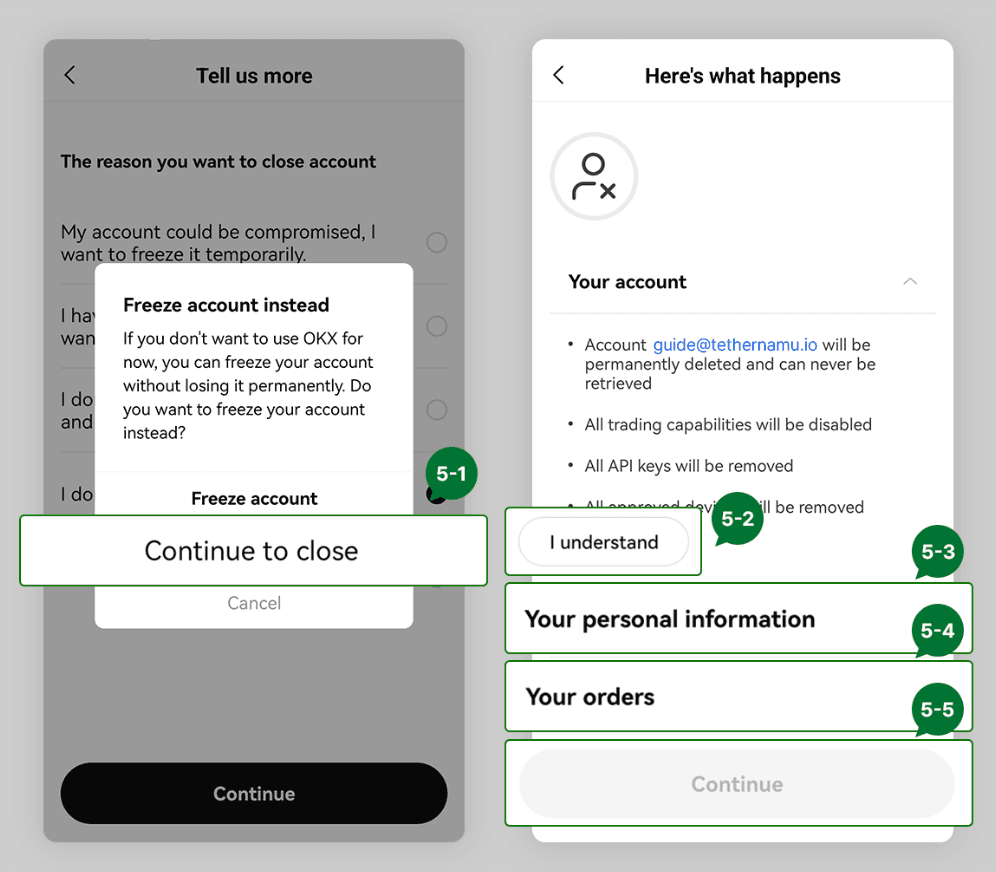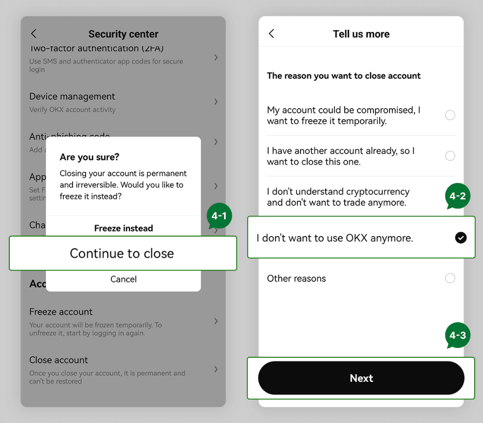 4. Continue to close를 클릭 후, I don't want to use OKX anymore.를 체크해 주세요.