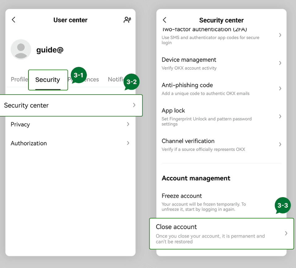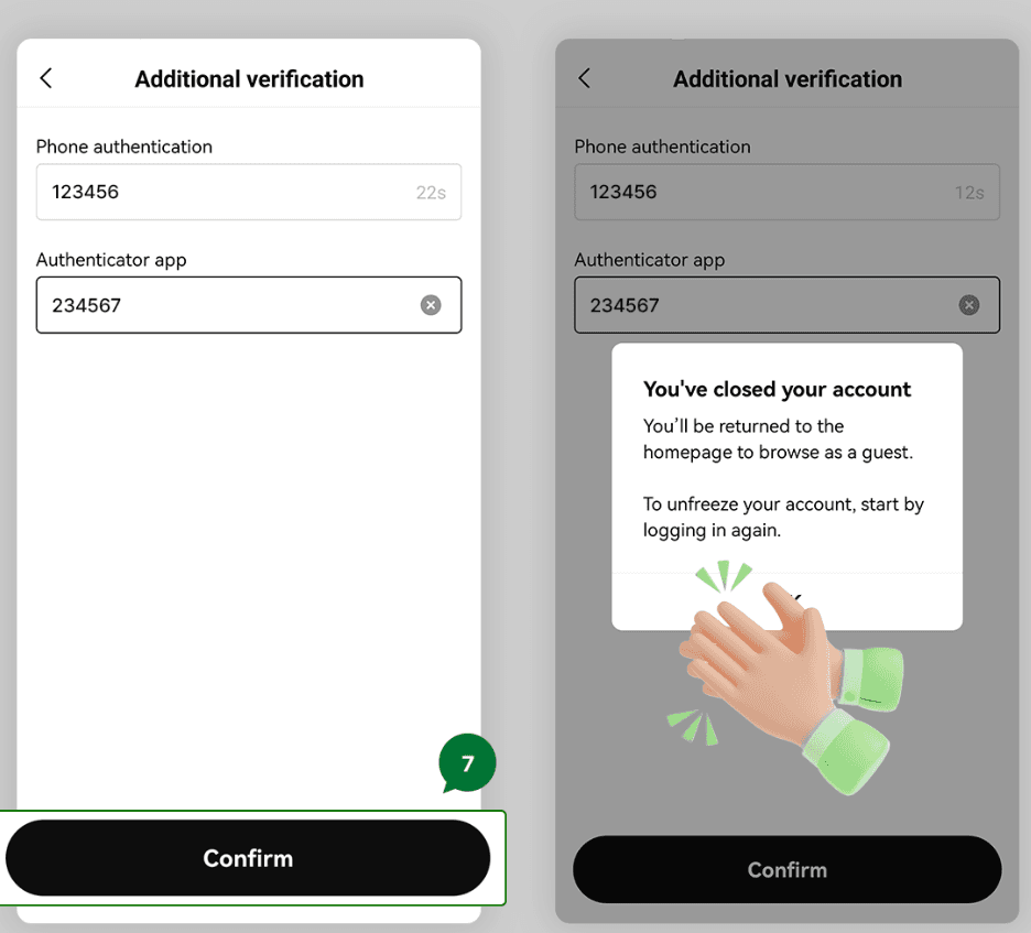 4. 비밀번호를 입력하고 이메일/구글 OTP 인증을 완료하여 계정 폐쇄를 완료하세요.