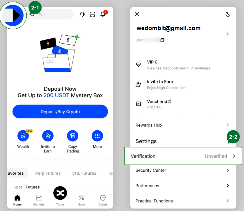 1. 빙엑스 어플에 기존 KYC가 인증되어 있는 계정을 로그인해 주세요.