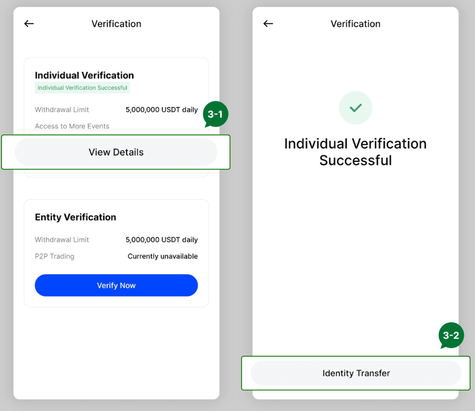 3. View Detail을 클릭 후, 다음 페이지에서 하단 Identity Transfer를 클릭해 주세요.