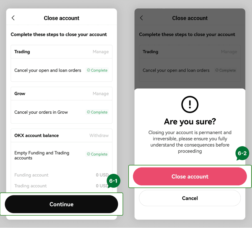 Continue를 클릭 후, Close Account를 클릭해 주세요.